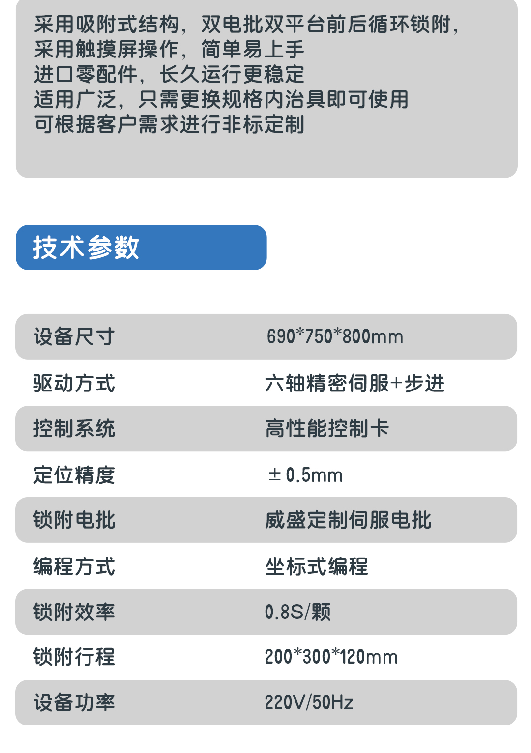 六軸雙平臺設計、提高設備生產效率,進口電批、定位更精確,量產報表實時監控生產數據,采用觸摸屏操作,簡單易上手,浮鎖、漏鎖、滑牙皆可檢測,精密級中小型螺絲選擇設備
